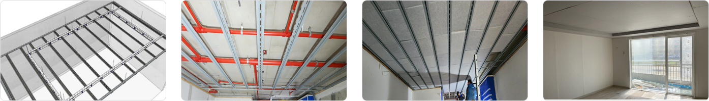 - 바닥슬래브와 천장구조를 연결하는 달대 설치를 최소화하고, 凸자형 천장프레임에 다공성 흡음재 설치가 용이하도록 고안된 천장공법 - 기존 천장공법(경량철골 및 목상 천장공법)과 달리 흡음재 거치가 용이하고 연결부 (달대)를 최소화함으로써 충격음 저감 성능과 시공기간 단축을 고려한 천장공법